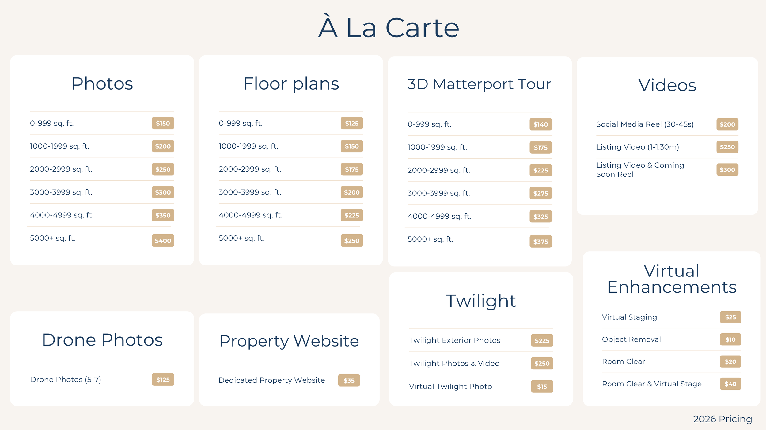 We offer a complete range of real estate media services to make showcasing your listings simple and stress-free. Whether you need photos, video, drone, floor plans, or 3D tours, we bring consistency, quality, and care to every project.